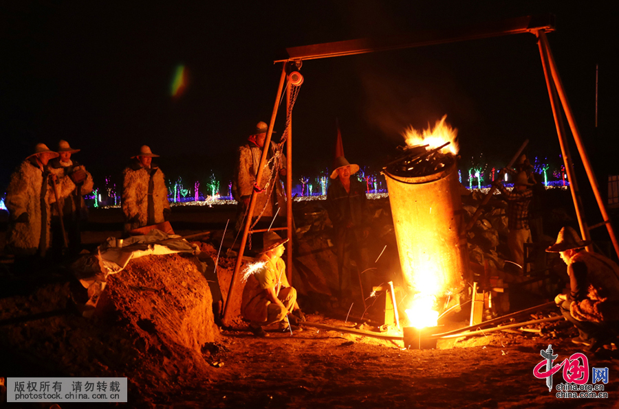 “打树花”艺人在用传统土法炼制铁水准备表演。陈晓东 摄