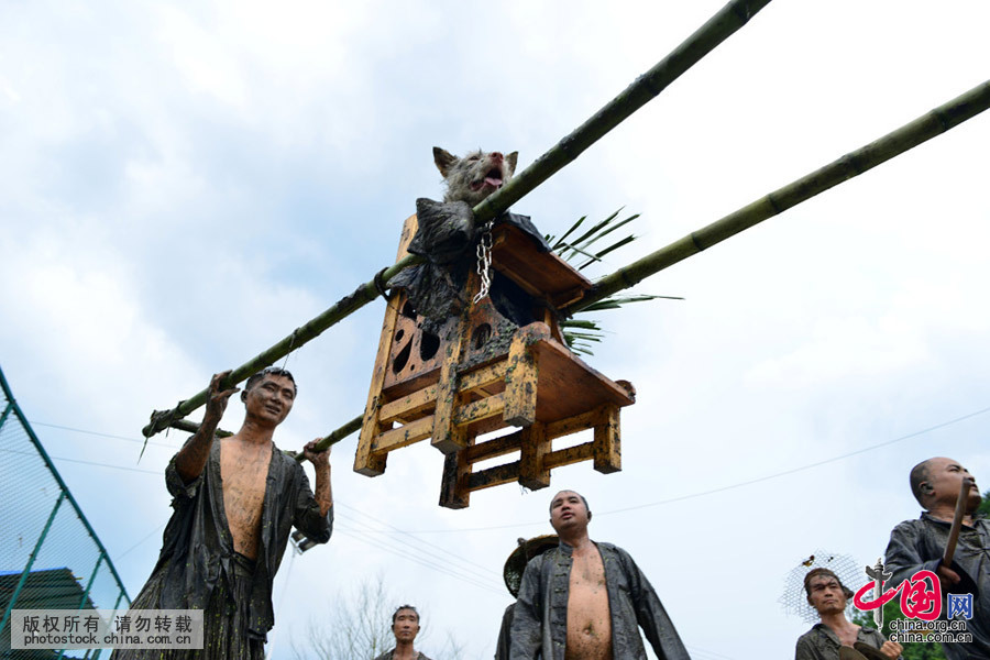 8月14日,在贵州省剑河县革东镇交榜村,人们在“抬狗节”活动中抬狗游行。杨文斌 摄