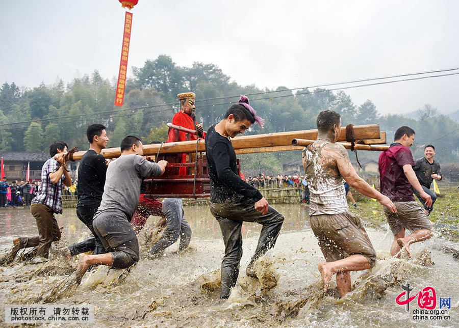 2017年2月8日,福建省长汀县童坊镇举河村如期上演“闹春田”客家乡村狂欢节,在灌满水的耕田里,村民扛着当地信奉的关公塑像在田里转圈、狂奔,溅起泥浆,踩水田、甩泥巴,好不热闹。
