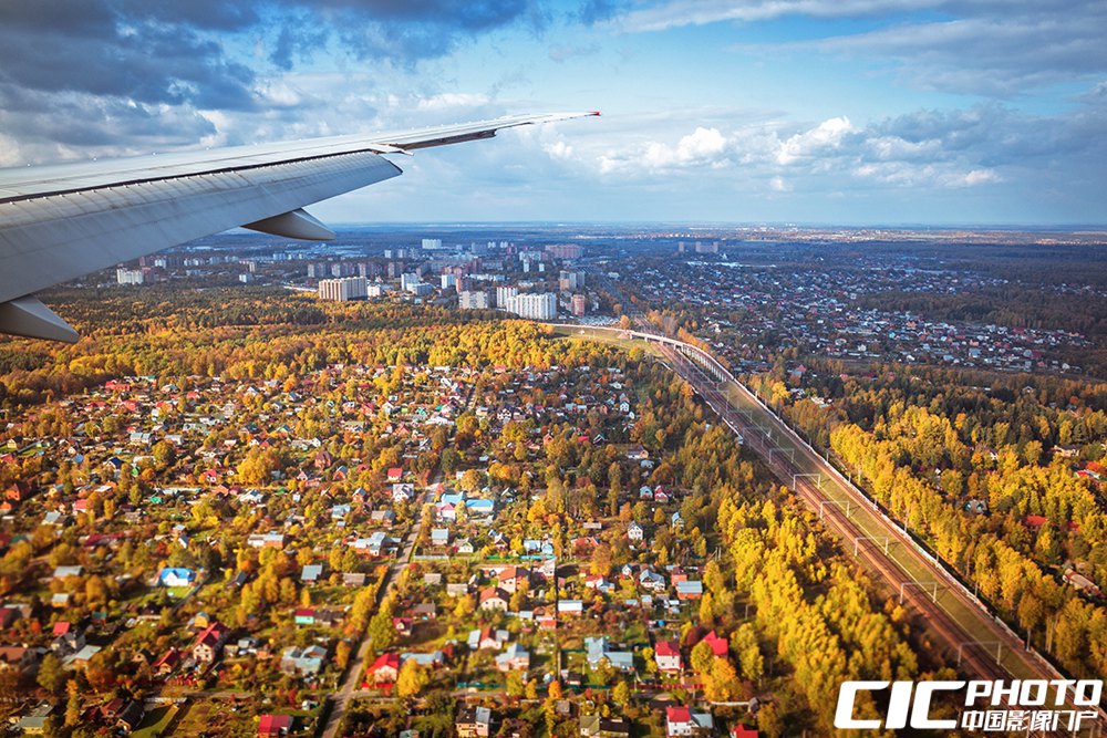 从即将降落到莫斯科谢列梅捷沃国际机场的SU205航班窗外望去,俄罗斯这个国家给人的第一印象,是湛蓝的天空和一望无垠金黄色的原野。(CICPHOTO/宫溟飞)