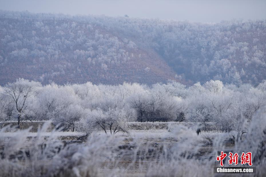 11月6日,中俄界江黑龙江上游呼玛江段岸边呈现雾凇美景。受降温和5日降雪、空气湿度加大影响,地处中俄界江黑龙江上游的黑龙江省大兴安岭地区呼玛江段两岸呈现雾凇美景,两岸树木银装素裹,玉树琼花,美不胜收。图为黑龙江上游呼玛江段两岸雾凇美景。中新社发周长平 摄
