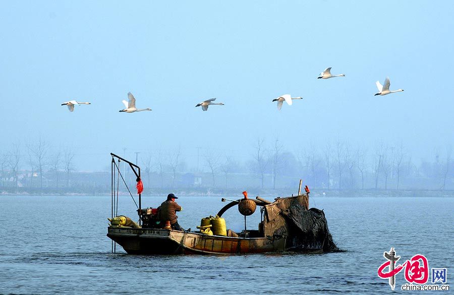 东大圩天鹅从正在生产的渔船上空飞过。李强摄影