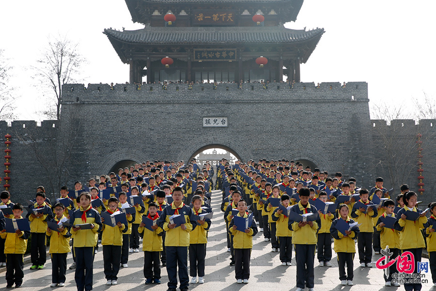 4月3日上午,山东省枣庄市台儿庄古城西门,响起整齐嘹亮的朗读声,“战地家书诵读”活动正式拉开帷幕。 中国网 杨佳 摄影