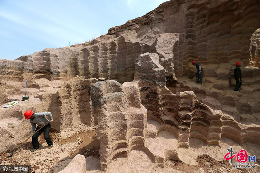 2017年4月10日,山东即墨环秀街道办事处前南庄村的村民在挖掘清理尘封的“石磨坑”。梁孝鹏/视觉中国