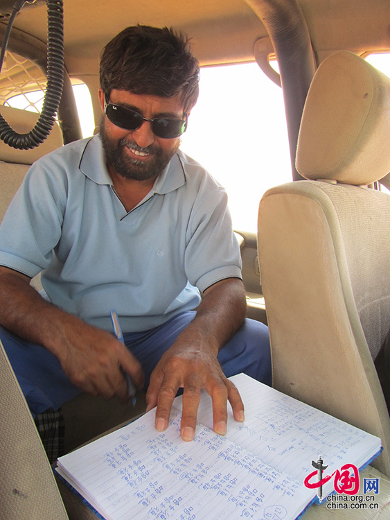 哈立德是一名测量员,来自巴基斯坦。日常工作间隙,哈立德会利用一切可以利用的机会和场所,积极练习中国的汉字。图为哈立德在野外工作间隙,坐在施工车辆里练习书写汉字。(王海坡 摄)