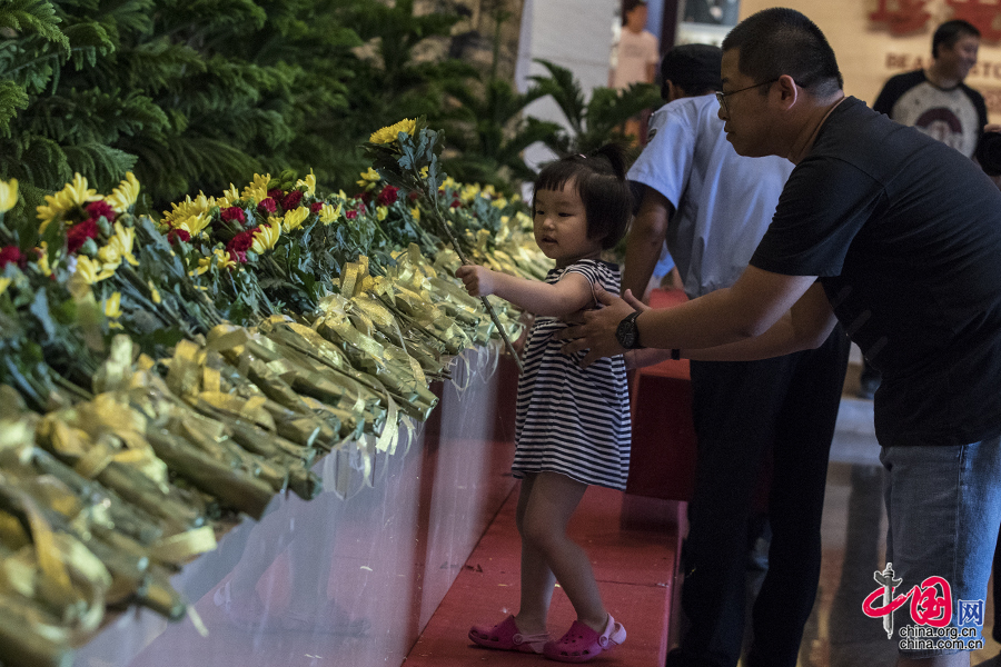 2017年7月7日下午,中国人民抗日战争纪念馆,一位小观众向英烈献花。 中国网记者 张若梦 摄