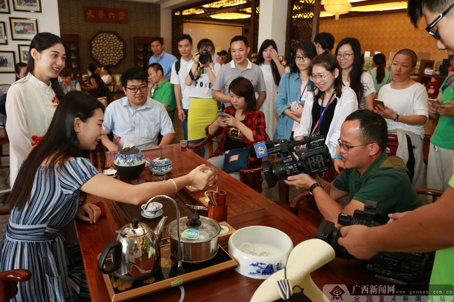 采访团成员体验烹茶技艺。 广西新闻网记者 黄河畅摄